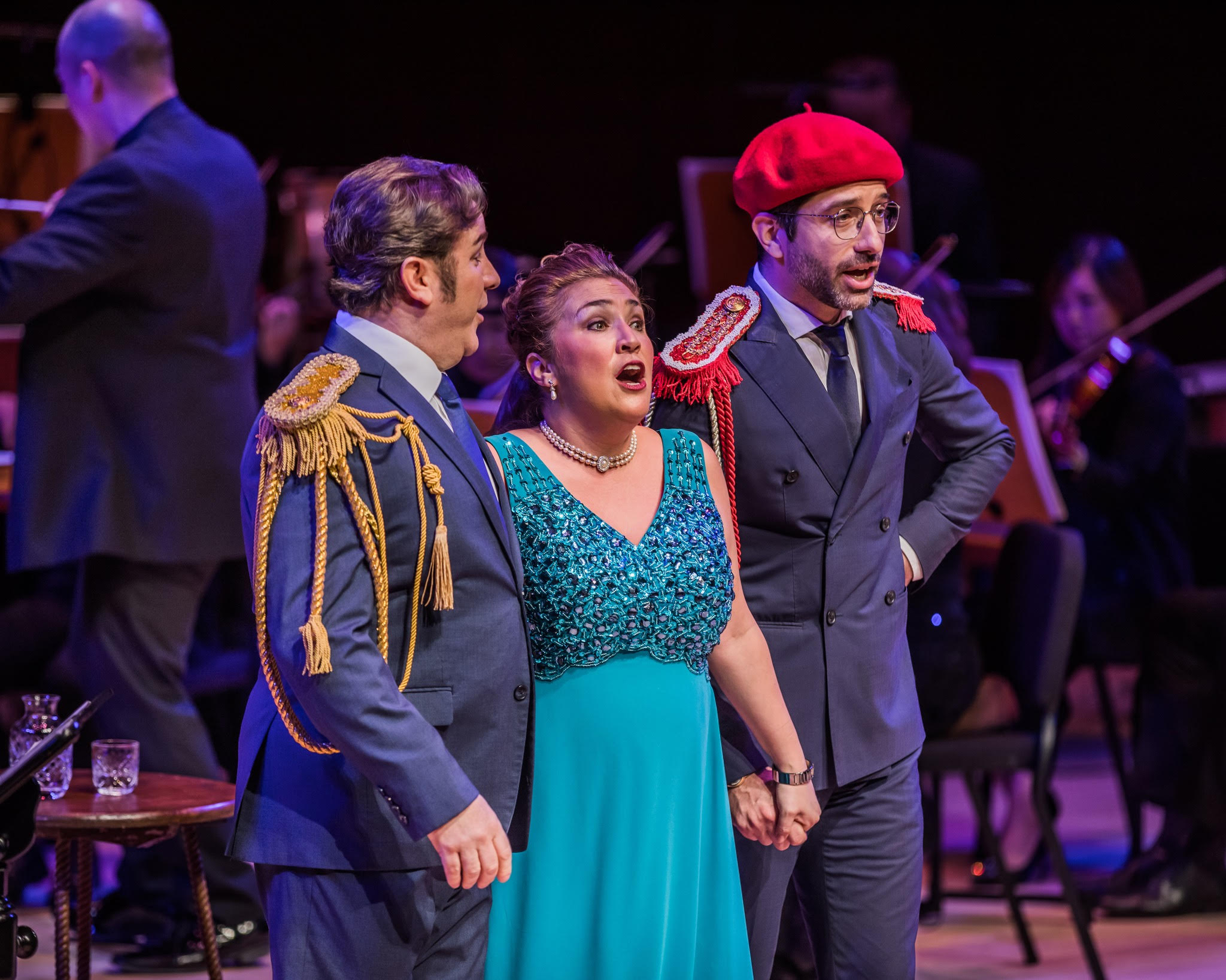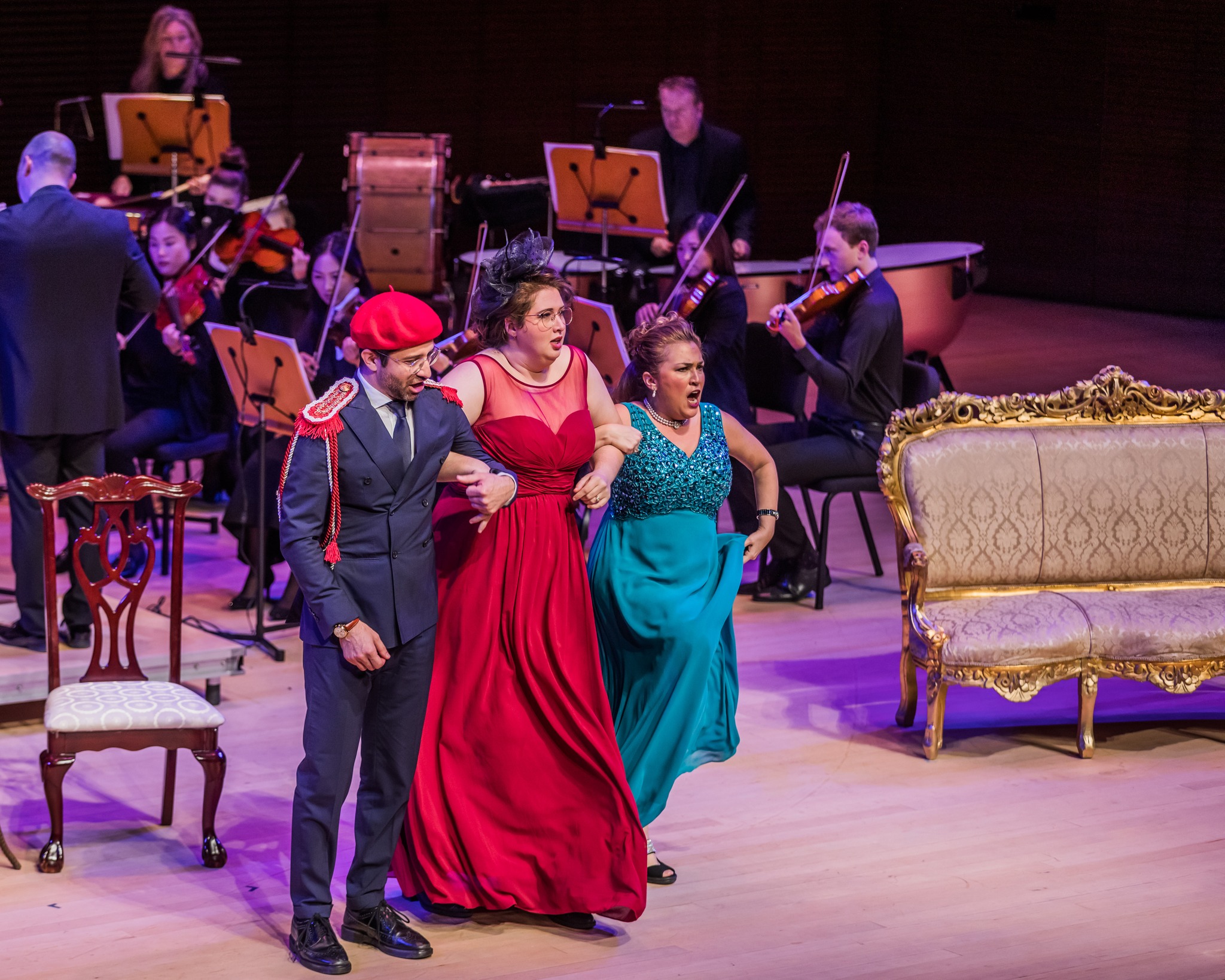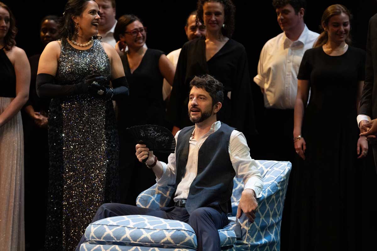 Mattia Venni was a sensational Crispino — his handsome baritone and capacity for self-parody allowed him to evolve from the melodramatic sobs of an almost-suicide scene to the complacent patter of success.